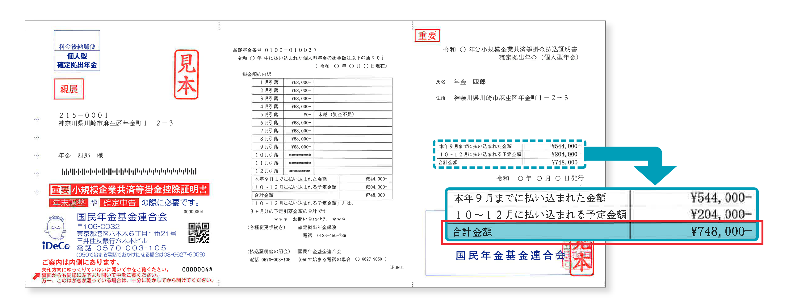 iDeCoの掛金は、小規模企業共済等掛金控除の対象となります。小規模企業共済等掛金払込証明書(以下、iDeCo控除証明書)とは、加入者ご本人に所得がある場合、所得控除を受けるために確定申告や年末調整のお手続きをする際に必要になる証明書です。iDeCo控除証明書は、年末調整や確定申告の際に必要となりますので、大切に保管してください。