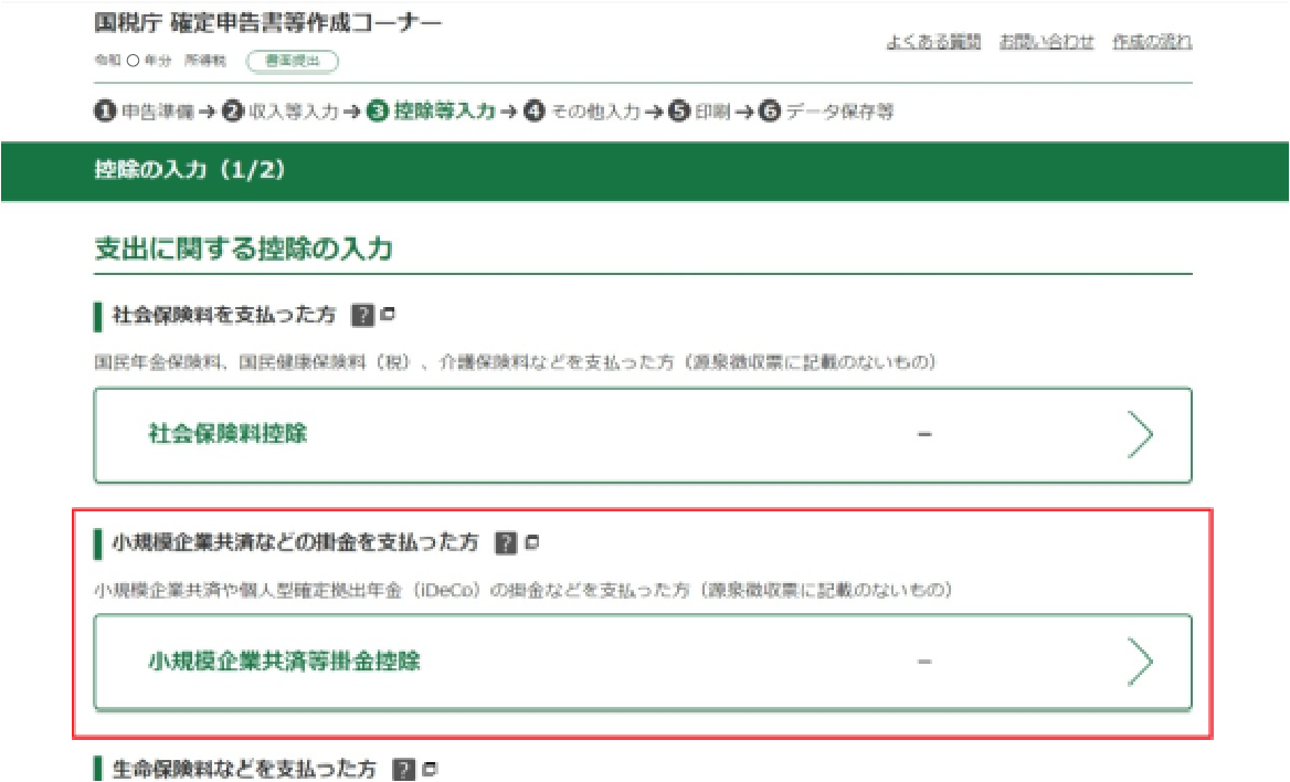 e-Taxの場合、「控除等入力」→「小規模企業共済等掛金控除」を選択しiDeCo控除証明書の合計金額を入力してください。