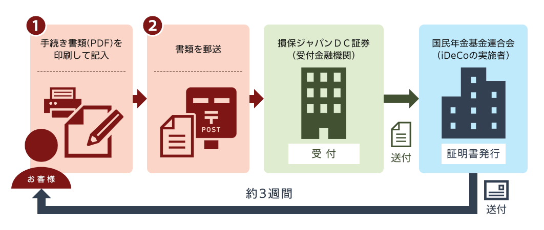 A4サイズで印刷し、ご記入のうえ郵送してください。なお、申請書の提出後、「iDeCo控除証明書」が届くまでに3週間ほどお時間を要します。